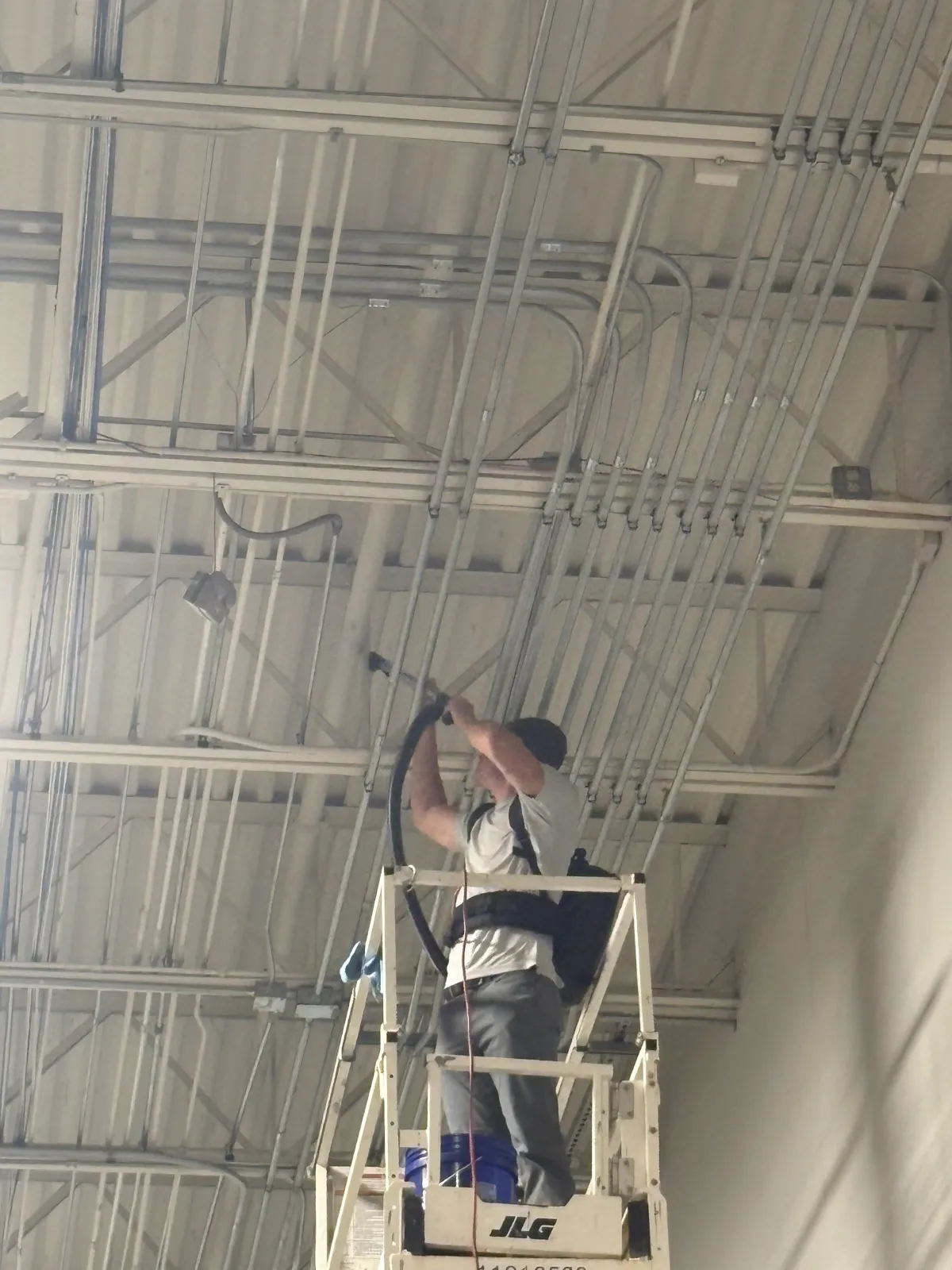 High-level overhead cleaning, often called high dusting, is the removal of dust and debris from elevated surfaces such as ceilings, structural beams, ductwork, lighting fixtures, and piping.
